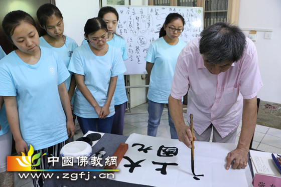 早八时,众营员齐聚抄经堂来听取原宣武师范学校张友梓教授所讲的书法课,同张友梓教授一起到来的还有原北京十五中校长吴秉寅先生,在开讲前吴秉寅先生赠送每名营员一本《三友书作集》,同时赠送给梵华精舍墨宝《松竹梅》。在书法课上张友梓教授先从字体的历史讲起,再到指导营员临帖,最后现场示范书写,让每位营员感受书法的魅力。