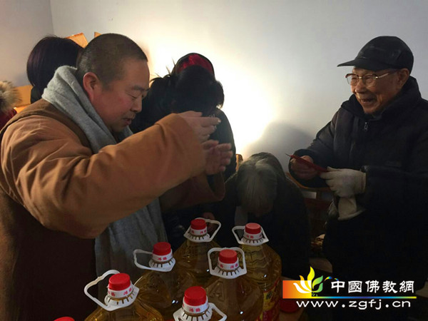 接着,隆慧法师做了发言, 他表示,今天是他故去的母亲九十诞辰日,借此机会,向李村的老人们表达自己的敬意,希望他们身体康健 ,事事顺利,新年快乐。并为本村52名老人及家庭送去过年物品,活动一直持续到中午才结束。