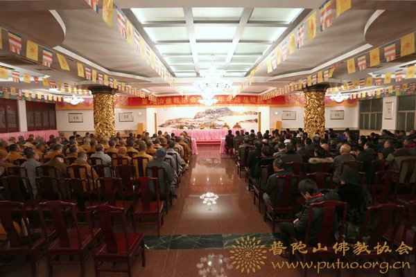 中国佛教新闻网浙江讯 2017年1月23日晚,普济禅寺全体僧职工大会在大斋堂隆重举行。普陀山佛教协会会长、普济禅寺方丈道慈大和尚,副会长兼秘书长门肃法师,副会长定明法师,咨议委员会副主席普净长老,普济禅寺副监院悟根法师、宽普法师等出席。会议由门肃法师主持。