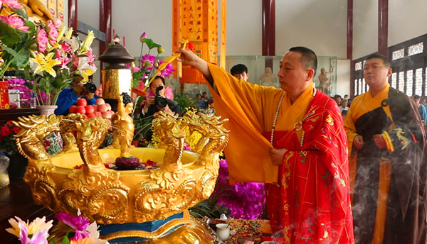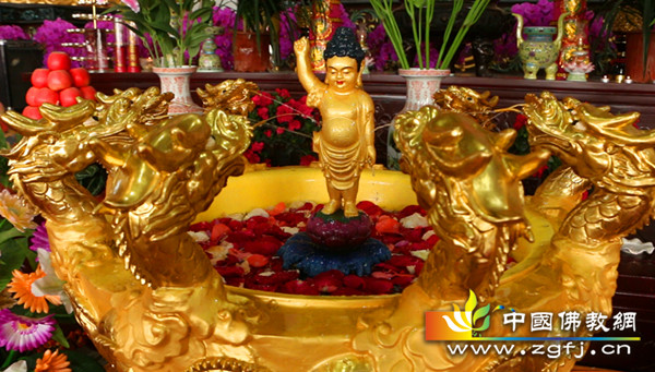 上午9时,石佛古寺大雄宝殿内浴佛祈福法会开始,法会由石佛古寺住持祖禅法师主法,主法法师带领两序仪仗迎请释迦牟尼佛太子像至大雄宝殿内法坛前,盆中由各种香花制成的香汤弥漫着清香。香汤中,释迦牟尼佛太子像,右手指天,左手指地,法相庄严。