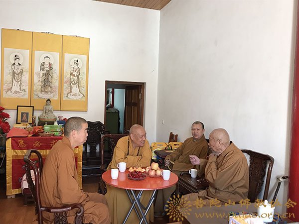 中国佛教新闻网浙江讯 2017年5月29日,端午节来临之际,中国佛教协会副会长、普陀山佛教协会会长、普济禅寺方丈道慈大和尚率佛协办公室副主任孙波居士、综治办副主任演通法师等一行赴定海祖印禅寺看望化通长老,祖印禅寺副监院启旻法师陪同接待。