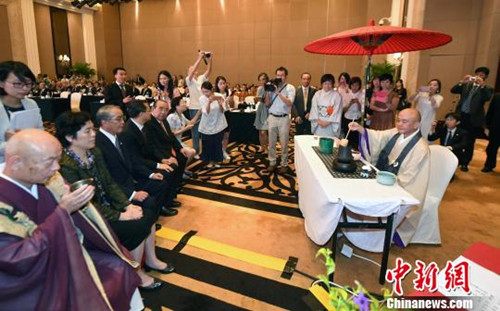 福建省政协副主席李红(左二)、长崎县知事中村法道(左三)、长崎县议会议长八江利春(左五)等中日嘉宾共同出席中日黄檗文化交流大会。刘可耕 摄