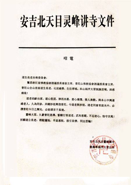 安吉北天目灵峰讲寺致唁电悼念道生长老(资料图)