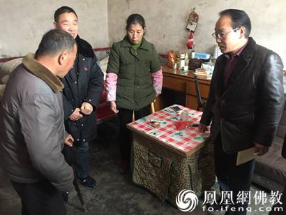 咸宁市民宗局副局长杨祥富询问贫困家庭情况(图片来源:凤凰网佛教 摄影:宗贤法师)