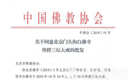 为绍隆佛种,续佛慧命,秉承世尊遗教,光大如来戒法,经中国佛教协会(中佛会[2019]45号文)批复同意,北京市门头沟白瀑寺2019年10月10日至11月10日传授三坛大戒。本次戒期将严格按照《国家宗教事务条例》、《全国汉传佛教寺院传授三坛大戒管理办法》、《汉传佛教教职人员资格认定办法》规定以及《关于进一步加强和规范汉传佛教传授三坛大戒工作的通知》(中佛会[2016]179号)的精神执行,欢迎条件具足的戒子报名参加。