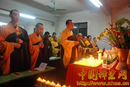 2010年4月15日晚,广东省南华禅寺曹溪佛学院全体师生举行诵经息灾祈福法会,诵经法会由该学院教务长传源法师主持。