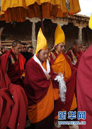 2010年6月6日,第七世热振•洛追嘉措赤烈伦珠活佛(左)迎接中国佛教协会副会长第十一世班禅额尔德尼•确吉杰布。当天,中国佛教协会副会长第十一世班禅额尔德尼•确吉杰布来到距离拉萨240公里的热振寺进行朝拜,并与第七世热振•洛追嘉措赤烈伦珠活佛会面。据介绍,热振寺创建于1057年,距今有900多年的历史,是一座著名的藏传佛教噶当派寺院。目前寺内有100多名僧人,热振活佛于2000年坐床。