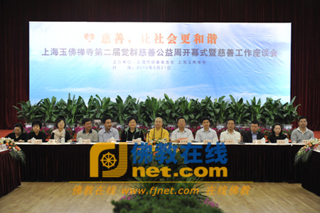 2010年6月21日上午,由上海市慈善基金会和上海玉佛禅寺共同主办的第二届“觉群慈善公益周”开幕式暨慈善工作座谈会在玉佛禅寺多功能厅隆重举行。本届慈善周的主题为“慈善,让社会更和谐”。上海市慈善基金会副理事长兼秘书长金闽珠,中国佛教协会副会长、上海市佛教协会会长、上海玉佛禅寺方丈觉醒法师,市民宗委三处处长何建,中共普陀区委常委、统战部部长夏斯德和来自市区有关部门的领导及社会各界人士三百余人出席活动。