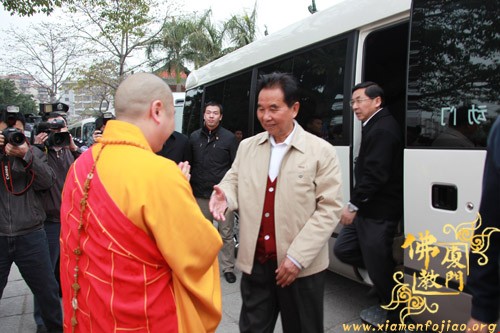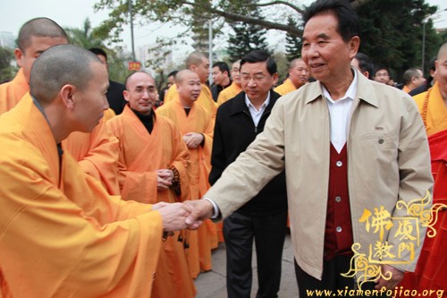 昨天上午,原中共中央政治局常委、中央纪检委书记吴官正一行在福建省省委常委、省纪委书记陈文清,福建省委常委、厦门市委书记于伟国,厦门市长刘可清,秘书长徐模,厦门市民宗局局长曾文瑛,一处处长黄镇辉等省、市领导的陪同下,莅临厦门南普陀寺视察。福建省佛教协会副会长、厦门市佛教协会会长、南普陀寺方丈则悟大和尚率众在天王殿前列队迎接。