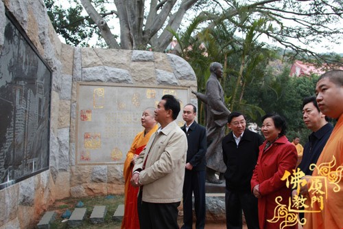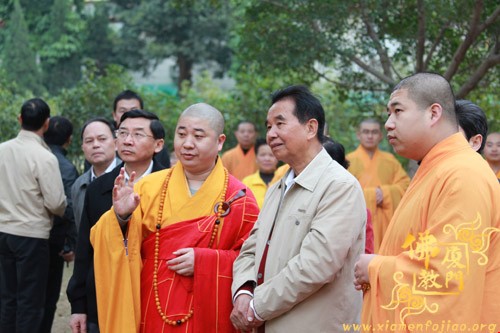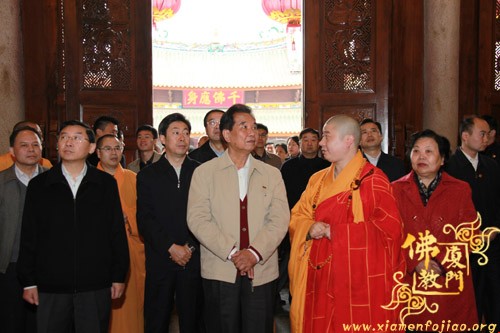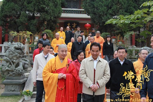 则悟大和尚陪同吴书记一行参观了天王殿、大雄宝殿、大悲殿、弘一大师铜像等处;并向吴书记汇报了南普陀寺发展现状和寺院未来的整体规划。吴书记听后颇为赞许,希望南普陀寺在方丈和尚的带领下,为促进佛教事业的发展作出更大贡献,从而更好地服务民众,回报社会。