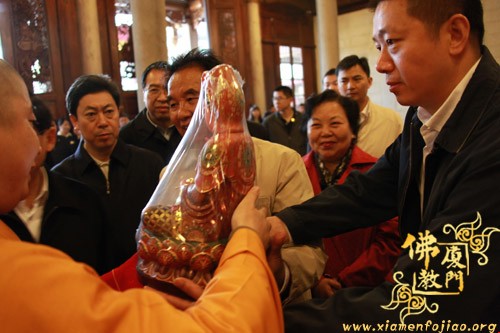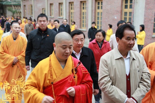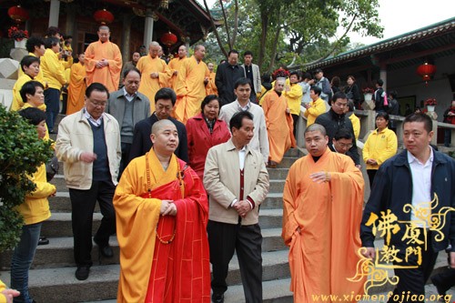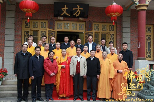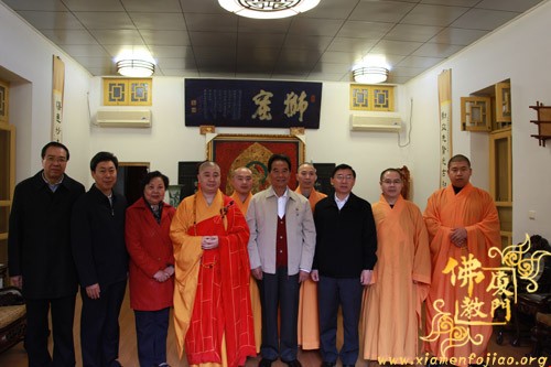 陪同接待的法师有:厦门市佛教协会副会长、闽院常务副院长、南普陀寺监院界象法师,市佛协秘书长、闽院副院长净心法师,闽院副院长、南普陀寺西堂传明法师,南普陀寺副寺圆满法师、知客德煌法师、法仪法师、戒舟法师等班首执事。