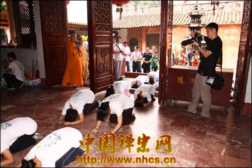 早上诵经法会结束后,宗岳法师为大家讲解了《礼拜的目的和意义》,他说以三步一拜的方式礼拜六祖,肯定会很辛苦,大家最好都坚持下来,若有坚持不下来的人,可以中途停在一边,走也走到六祖身边。以往参加过“禅悦行”活动的营员一致认为这块内容给他们留下了最为难忘的印象。他还说,忏悔作为一种修行方式,能迅速的使人认识自己,而三步一拜就是最广大意义的忏悔。