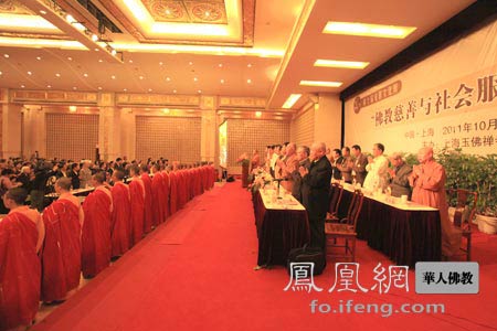 凤凰网华人佛教上海讯:2011年10月18日上午,上海玉佛寺第十届“觉群文化周”在玉佛寺觉群楼多功能厅隆重开幕。上海市民族与宗教事务委员会副主任王君力,中国佛教协会副会长、上海市佛教协会会长、玉佛寺方丈觉醒大和尚,普陀区人大常委会副主任曹玉茂,普陀区委统战部副部长、区民宗办主任张桂文,上海市佛教协会名誉会长妙灵长老,上海市佛教协会副会长周富根居士等各级领导,及中国人民大学宗教高等研究院院长方立天教授,北京大学宗教研究院名誉院长、学术委员会委员楼宇烈教授,中国社科院荣誉学部委员、世界宗教研究所研究员杨曾文教授,中国宗教杂志社副主编胡绍皆研究员,北京金城出版社社长张朴远,中国社科院《世界宗教研究》杂志社社长黄夏年教授,台湾中华佛学研究所名誉所长李志夫教授,复旦大学宗教研究所所长王雷泉教授,华东师范大学宗教与社会研究中心主任李向平教授,香港佛教联合会宗教事务监督觉真法师等相关高校、研究机构的专家、学者,玉佛寺法师、居士约600余人出席了开幕盛典。